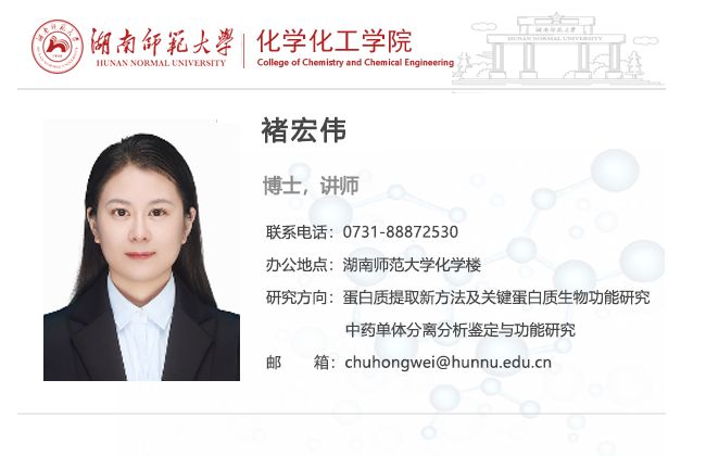 褚宏伟 2022年8月博士毕业,于大连理工大学-中国科学院大连化学物理研究所联合培养,师从张玉奎院士、张丽华研究员与钟世钧教授。曾获得大连化学物理研究所-岛津一等博士研究生奖学金,硕士研究生一等学业奖学金等,获岛津(中国)资助参加第49届国际HPLC大会(日本京都)做口头报告。