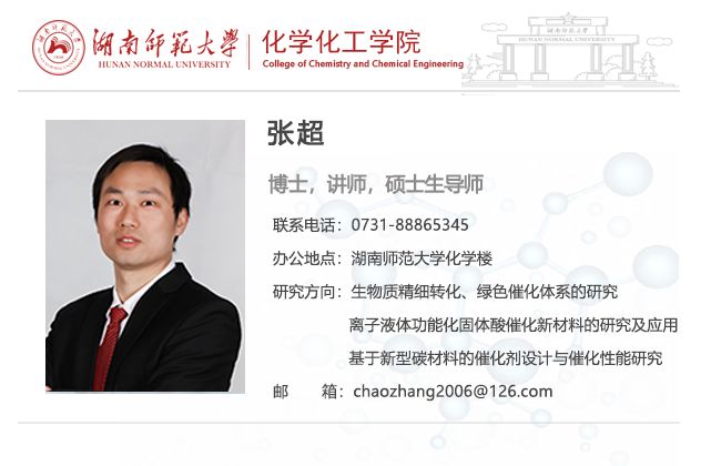 张超,理学博士,讲师。2015年留校任教。致力于生物质精细转化领域的探索研究,首次报道设计合成了一系列高效仿酶催化剂,大幅度提高了催化纤维素水解的效率,并取得一些阶段性的成果,并得到国际同行专家的高度认可。相关研究成果已在Green Chem., Cellulose, Ind. Eng. Chem. Res.等国际著名期刊发表SCI论文8篇,申请国家专利5项。曾获博士研究生国家奖学金、校优秀硕士研究生和校优秀博士研究生等荣誉。