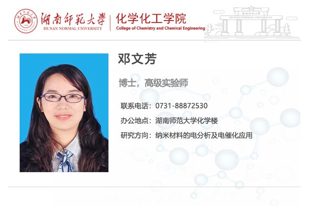邓文芳高级实验师硕士生导师伟德国际victor1946分析化学博士导师马铭教授加州大学圣克鲁兹分校联合培养博士合作导师陈少伟教授湖南大学博士后合作导师王双印教授分析化学实验室管理及分析实验物理化学实验教学等工作