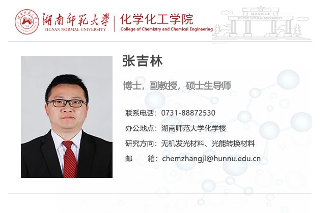 张吉林,2010年毕业于中山大学,获理学博士学位(导师龚孟濂教授、石建新副教授);2011年01-09月于香港浸会大学物理系做研究助理。2011年11月始任职于伟德国际1949,入选伟德国际victor1946“世承人才计划”青年优秀人才,为“发光材料及应用”伟德国际victor1946重点实验室副主任及方向负责人、“光能转换材料”湖南省普通高等学校重点实验室主要研究人员。任职以来在Chem. Mater., Inorg. Chem., Chem. Eng. J., ACS Appl. Mater. Interfaces, J. Mater. Chem. C等SCI源期刊发表学术论文近100篇;主持完成国家自然科学基金青年项目1项、教育部博士点基金新教师类项目2项、湖南省自然科学基金面上项目1项、教育厅优秀青年基金项目1项。指导的研究生中多人获评国家奖学金、校级优秀毕业论文、省级优秀毕业研究生。